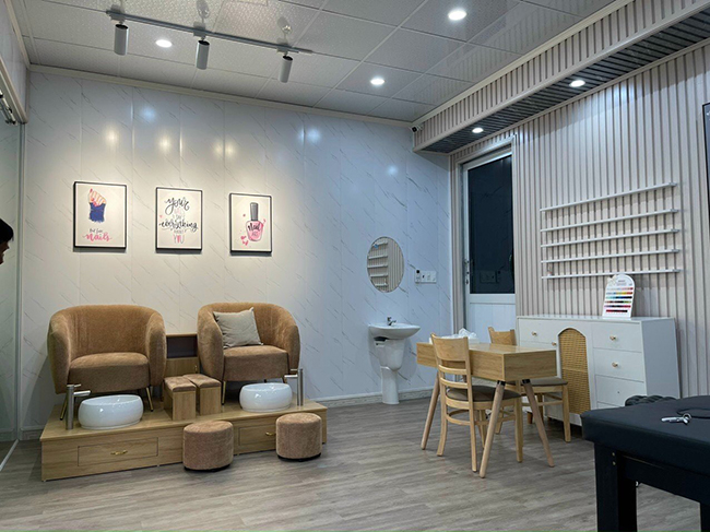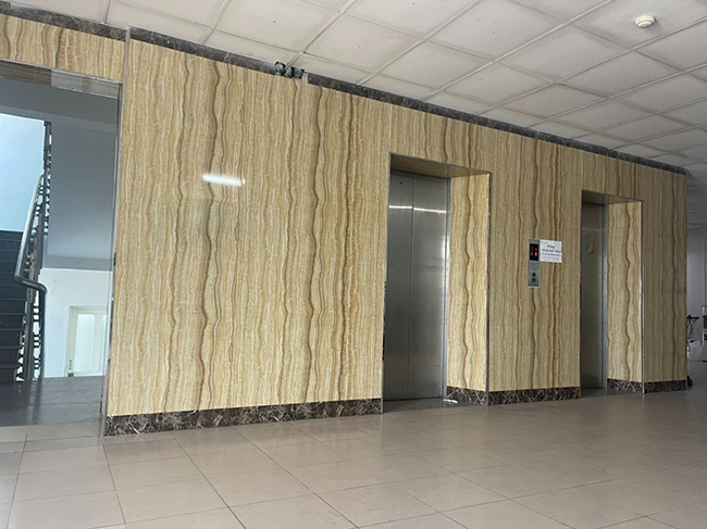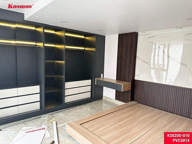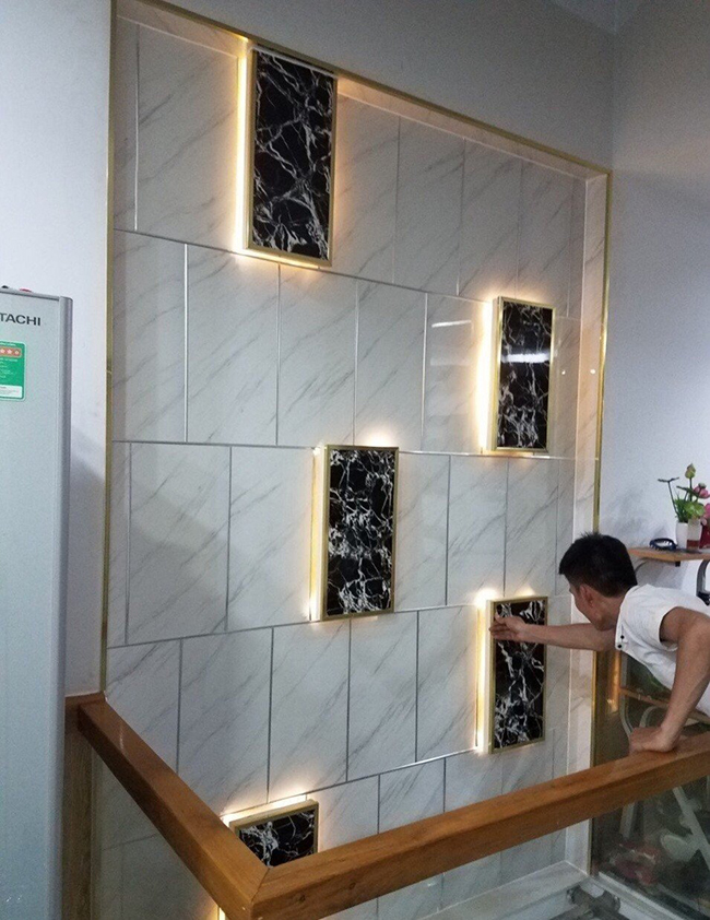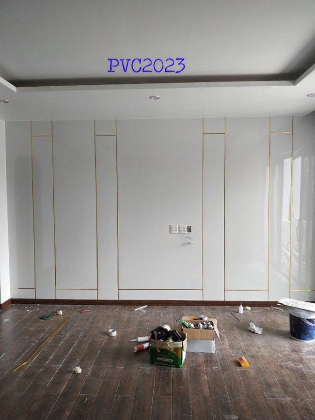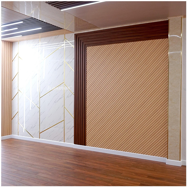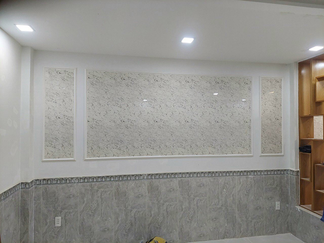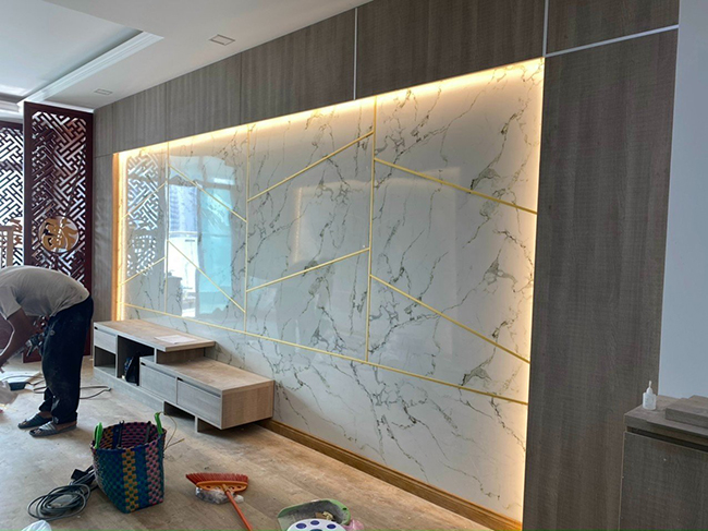 Hình ảnh thi công tấm ốp PVC vân đá kết hợp lam sóng trong nhà