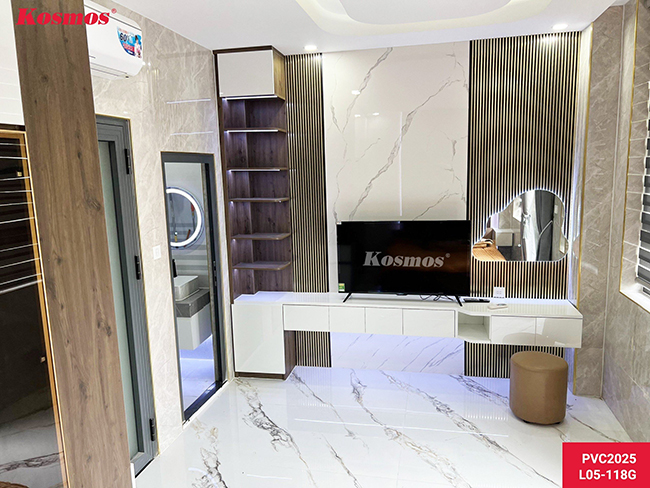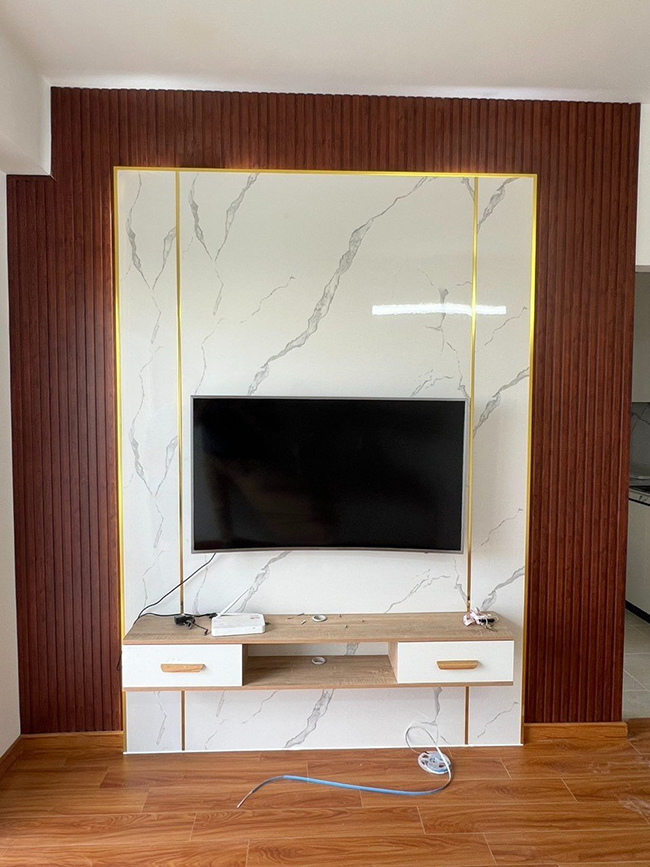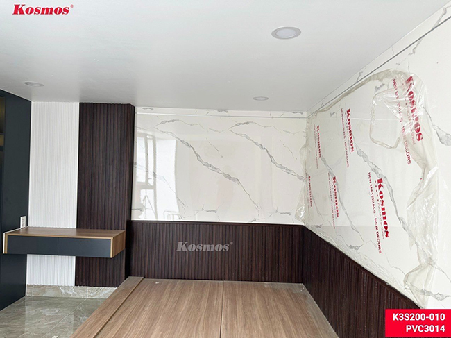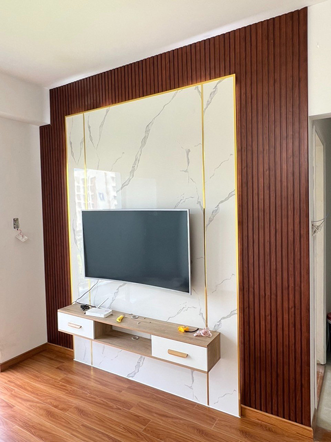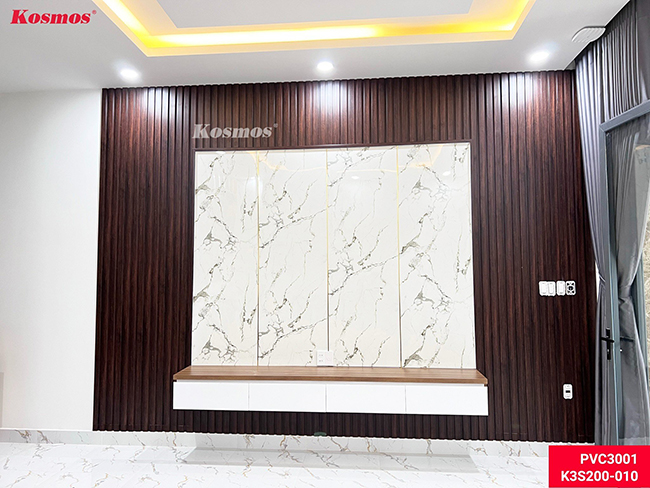 Thi công tấm ốp PVC vân đá kết hợp lam sóng trong nhà – Không gian nội thất sẽ hài hòa, hiện đại hơn nếu bạn kết hợp hai vật liệu này với nhau tạo thành một bức tường đẹp, điểm nhấn thu hút cho toàn bộ không gian phòng khách, backdrop,…